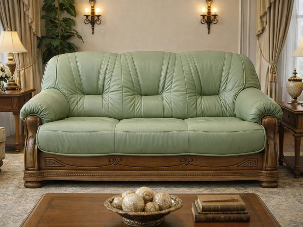 Для изготовления мягкой мебели «Милан» используется кожа производства Италии и России. По цвету, мебельные кожи подразделяют: черные, цветные, многоцветные, матовые и блестящие с нанесением прозрачной лаковой эмульсии. В качестве наполнителя и формообразующего материала для мягких элементов сидения и спинки (спинка с подлокотниками изготавливается одним чехлом) в данных наборах применяется: ППУ (пенополиуретан) разной плотности и типоразмеров ( в зависимости от места его расположения в изделии, т.е. сидение, спинка, подлокотник). Синтепон применяется как настилочный материал, используемый в качестве пружинящей прослойки между покровным обивочным материалом и основным формообразующим материалом, которым для данного изделия является поролон. Каркасы мебели «Милан» выполнены из массива дуба и плиты ( МДФ, облицованной шпоном дуба). В креслах и диванах нераскладываемых под мягкие элементы сидения крепится ортопедическая решетка. Опоры передние изготовлены из массива древесины лиственных пород. Сочетание натуральных материалов, массива дерева и натуральной кожи, говорит об исключительном вкусе и респектабельности хозяина, а оригинальное исполнение каркаса из массива дуба с элементами резьбы сделает ваш интерьер неповторимым.