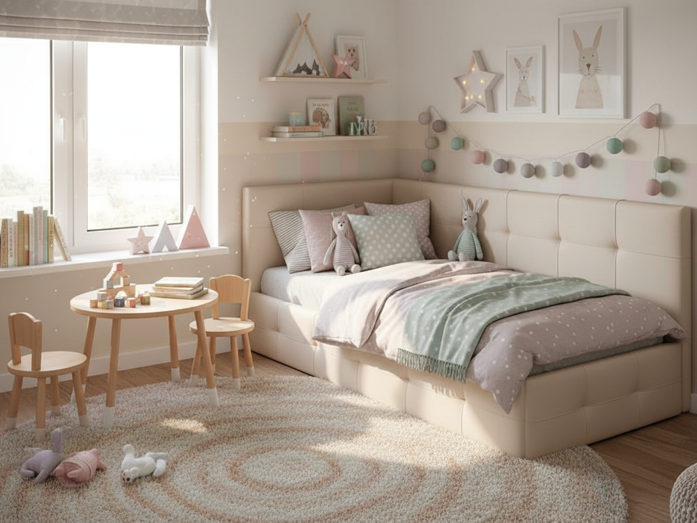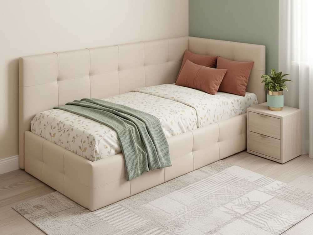 Мягкая боковина и задняя стенка этой кровати полностью исключают возможность травмирования, поэтому эта кровать безопасна для детей. Обивочная ткань мягка и приятна на ощупь. В конструкцию кровати встроен подъёмный механизм. Он легко открывается, предоставляя доступ к просторному коробу для белья. Короб разделён на ниши для более эргономичного хранения постельных принадлежностей.