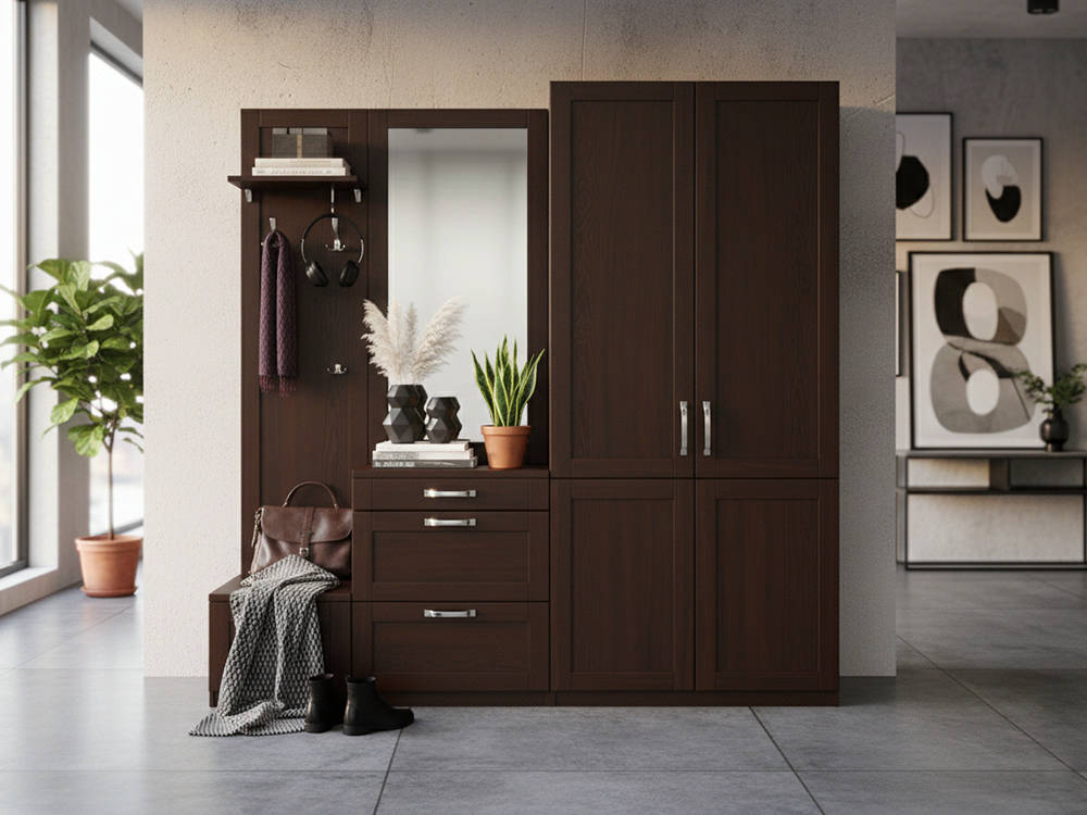 Прихожая «Карина» — это стильное и функциональное решение для организации пространства входной зоны, сочетающее в себе качество материалов, продуманную конструкцию и современный дизайн. В составе: шкаф со штангами и полками, тумба для обуви, ящик для мелочей, ящик для обувных принадлежностей, зеркало, вешалки и полка для головных уборов.