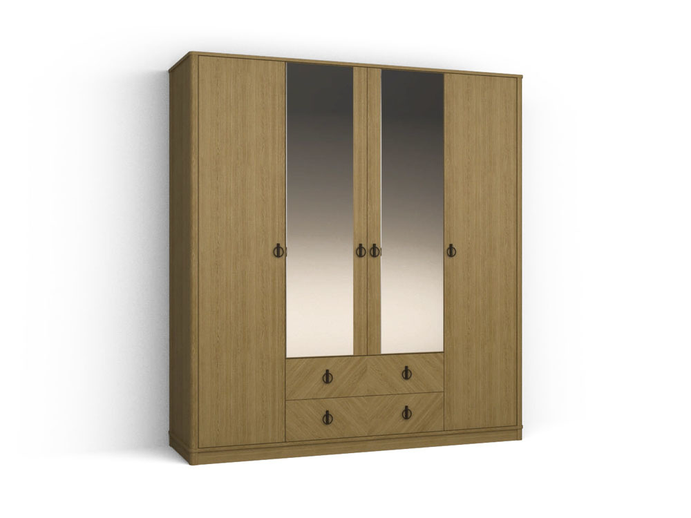 Набор мебели для спальни «Ария» изготовлен из массива дуба, плит ДСП и плит МДФ. Стойки и ножки изготовлены из массива дуба, крышки из плит МДФ облицованных шпоном, стенки боковые, перегородки и стенки горизонтальные из плит ДСП облицованных шпоном, стенки задние из ламинированной ДВП. Фасад донного изделия имеет художественный набор шпона. Отделка: вариант цвета «Классик» Фурнитура: лицевая фурнитура дверей шкафа производства «AKS», петли для дверей производства «Boyard» с доводчиком. Направляющие производства «Boyard» частичного выдвижения с системой бесшумного закрывания.